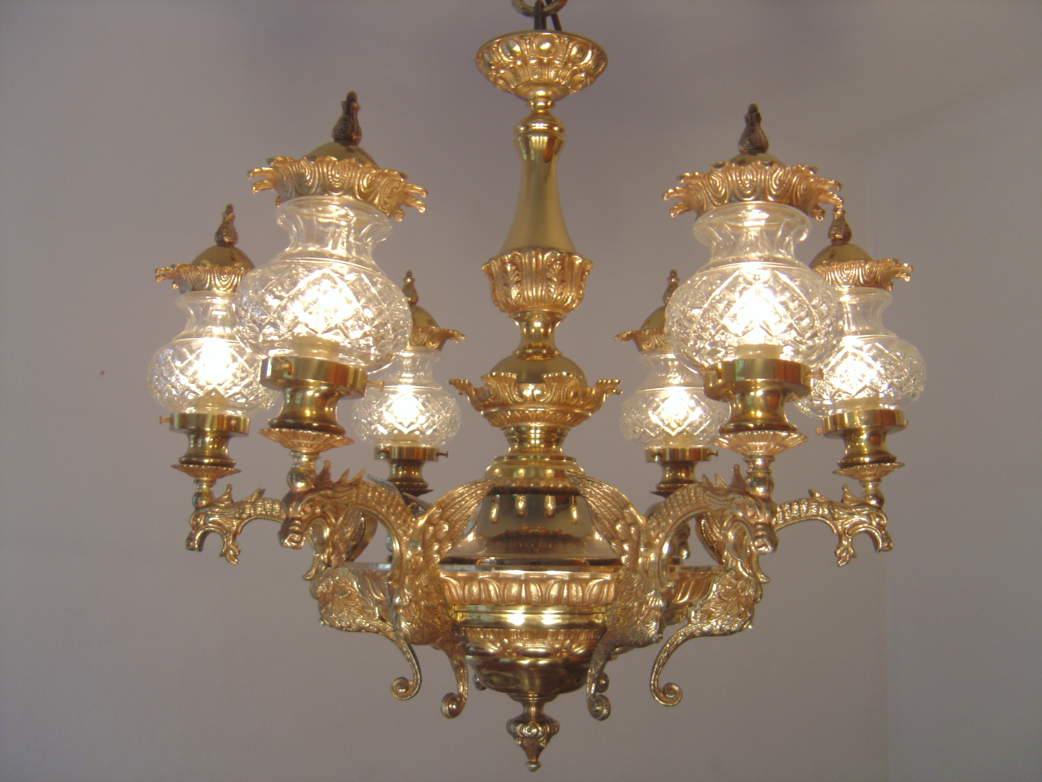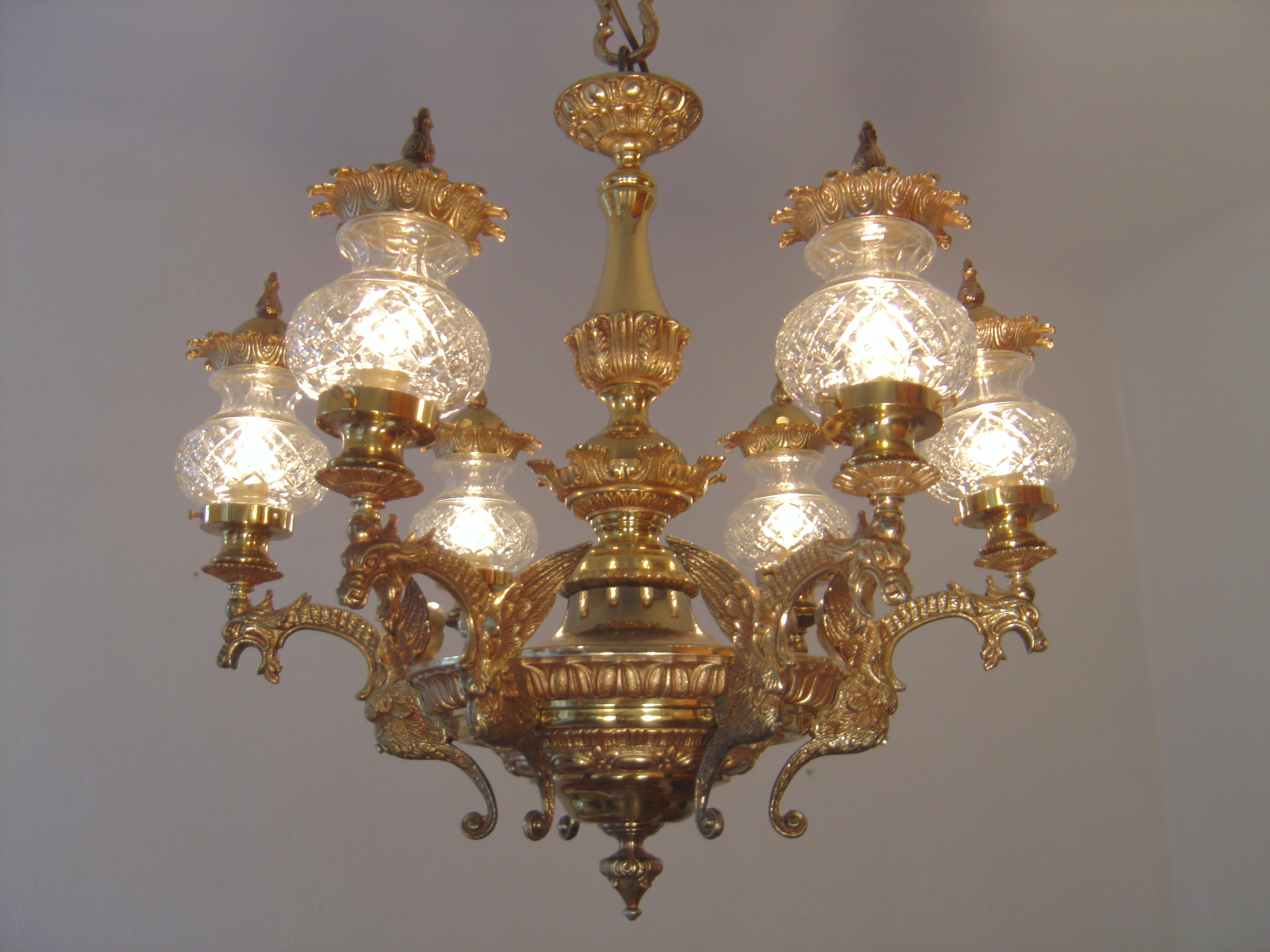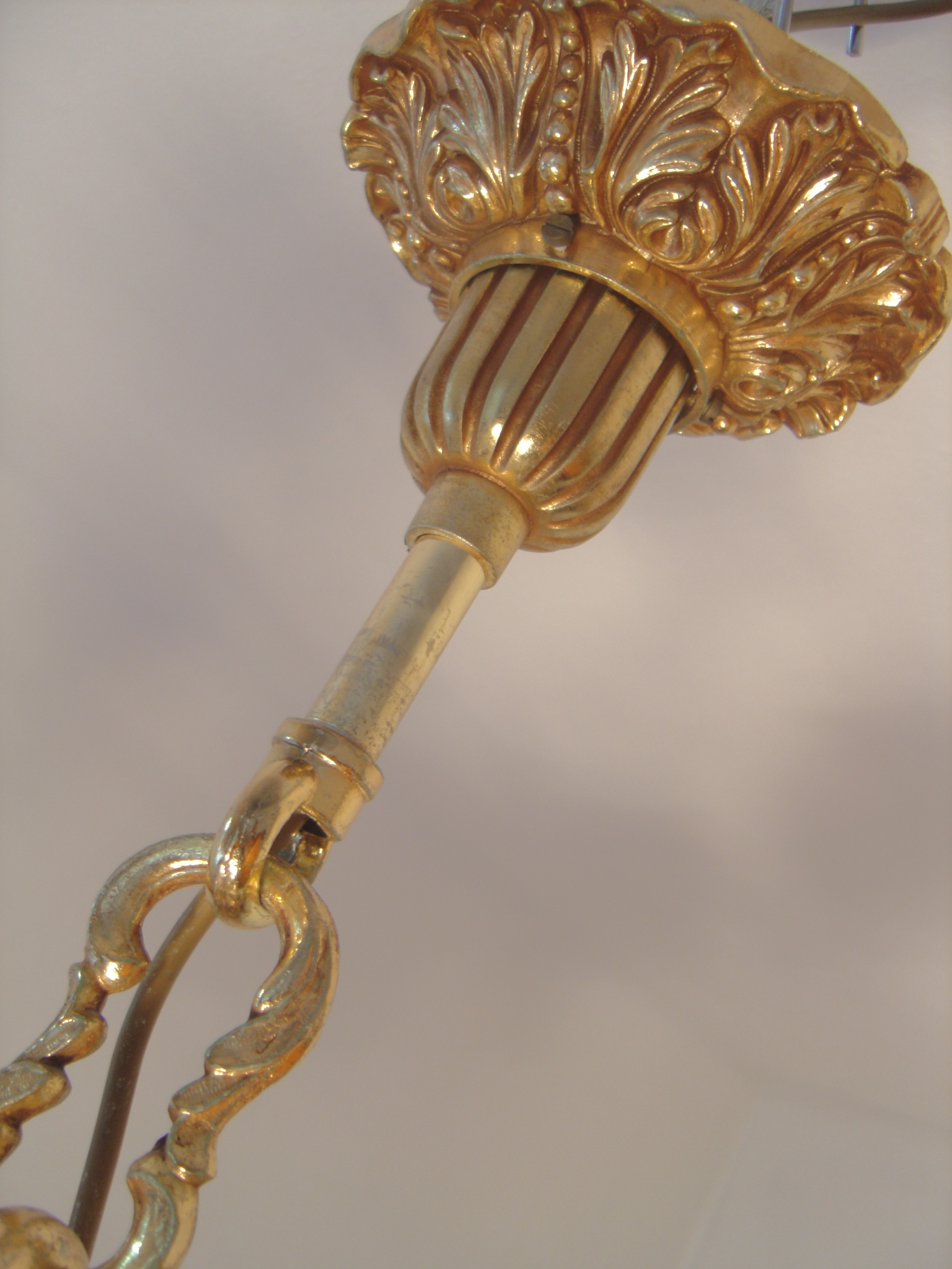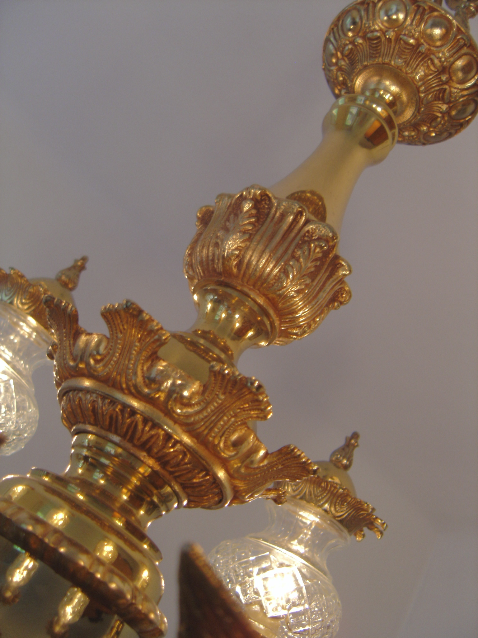 Der Leuchter besteht aus massivem Messing in warmer Goldtönung und bringt ein stattliches Gewicht von ca. 16 kg mit.
