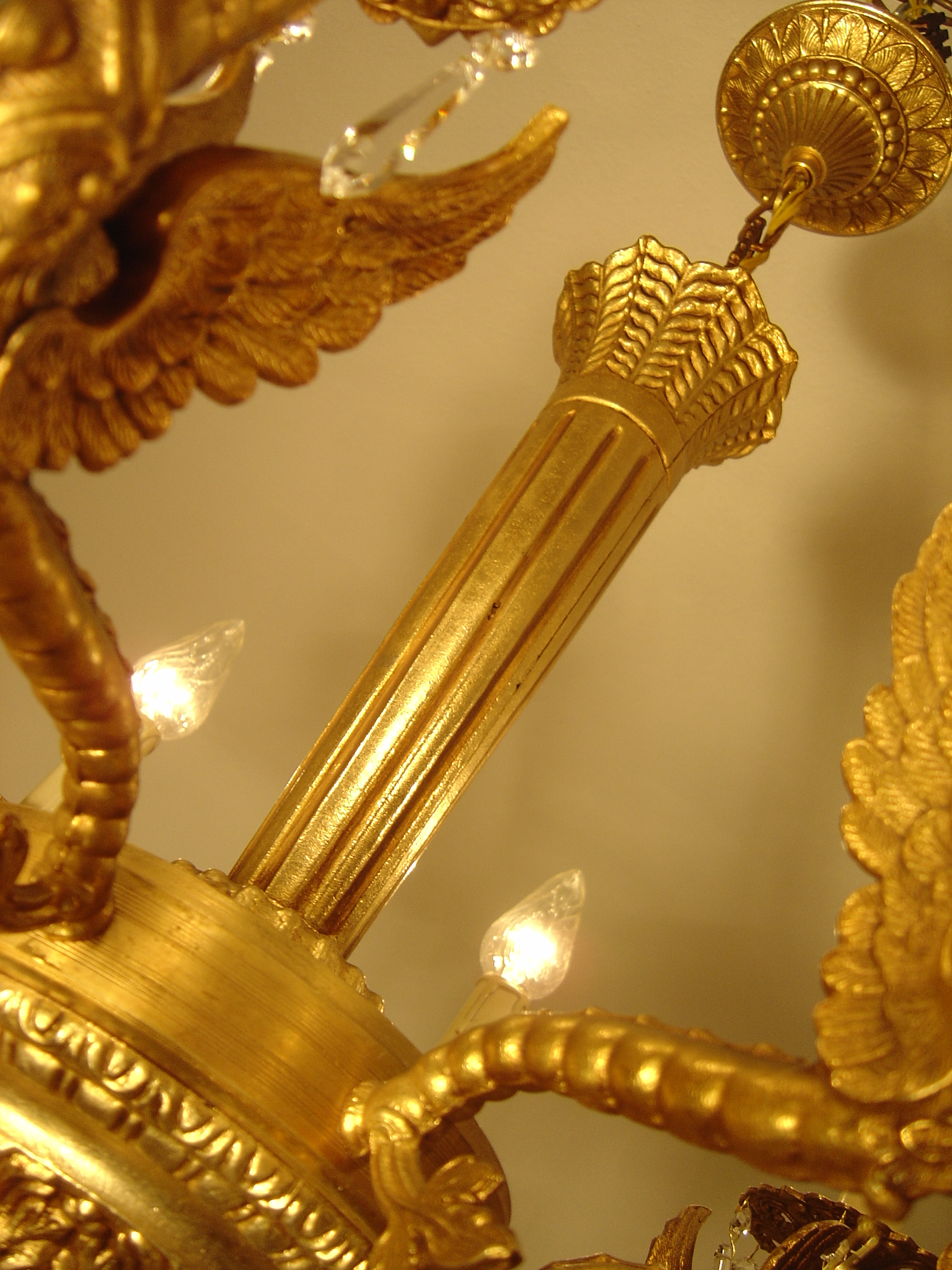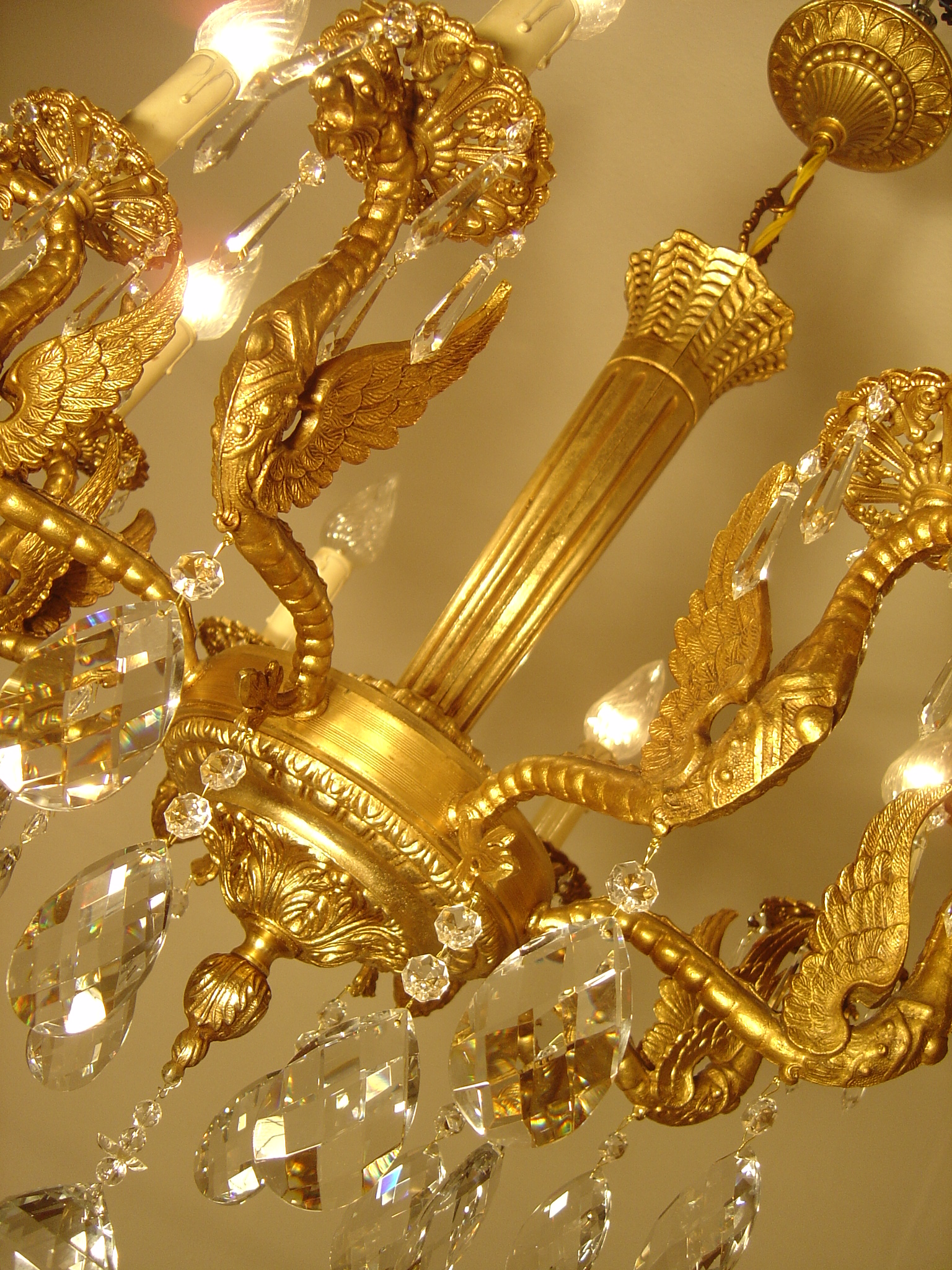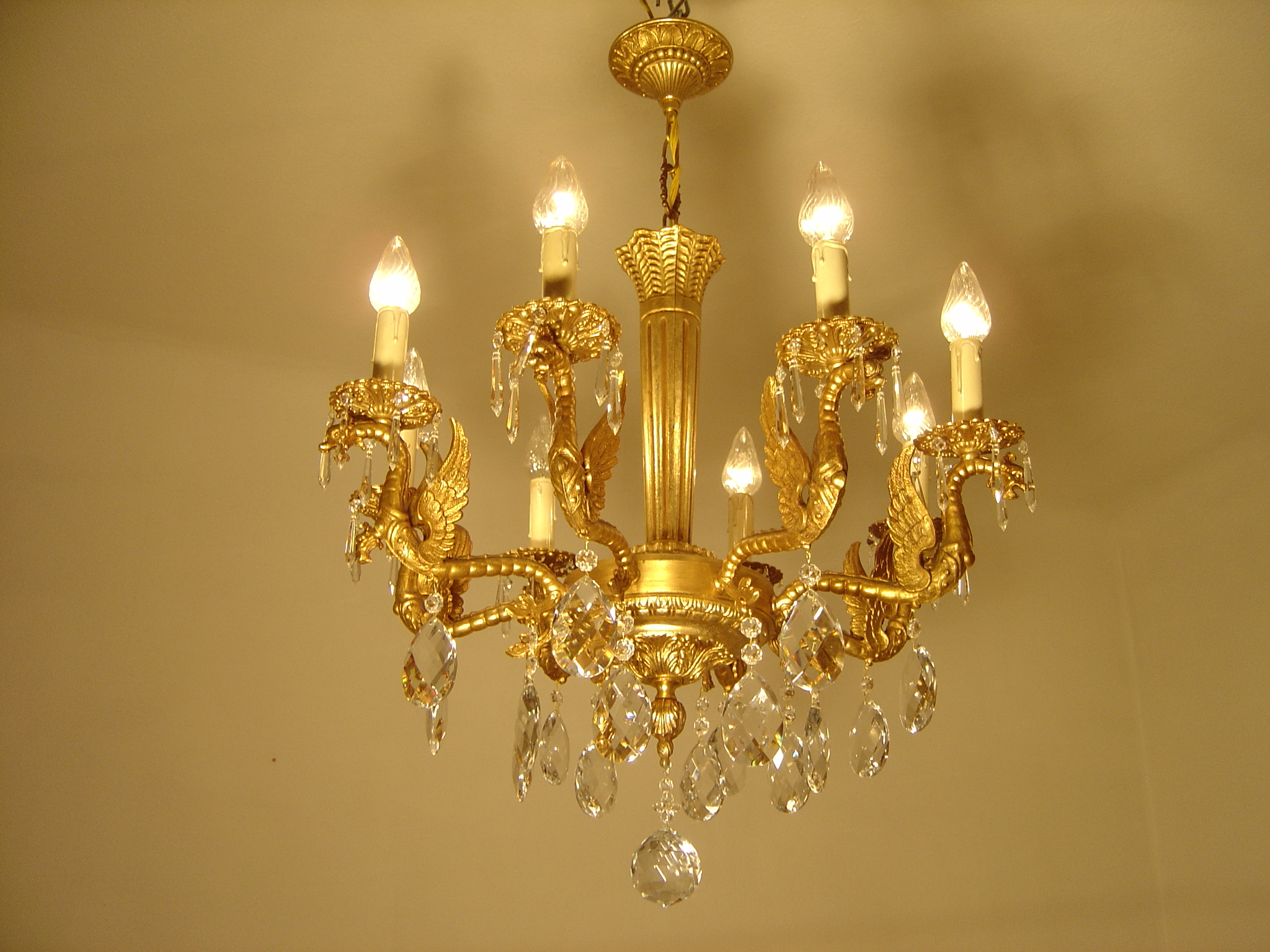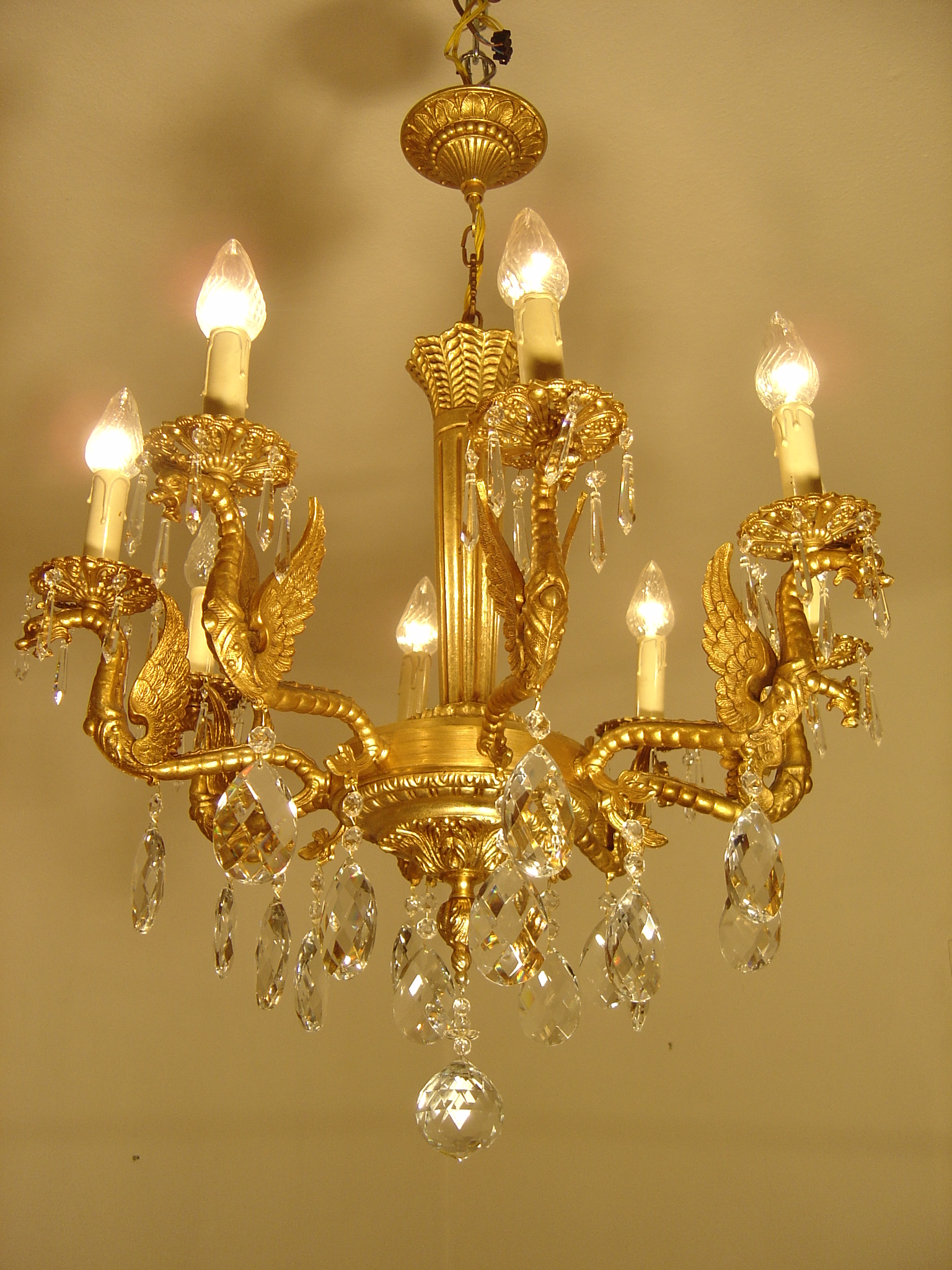 Zur Auktion steht ein sehr schöner 8 flammiger Kronleuchter mit geflügelten Drachenfiguren. Der Korpus besteht aus massivem Messing mit einer Goldbronzepatina und wiegt ca. 17 kg. Die lange konische Mittelsäule ist fein kanneliert. Die 8 Flammen stehen auf ornamentierten durchbrochenen Tropfentellern, umhüllt von noch originalen Tropfenhülsen, aus gewachstem Karton mit Stucktropfen. Der Unterbehang der Arme sind große Kristallwachteln mit Rautenmuster. Die Tropfenteller schmücken jeweils 6 hochwertige lange Eisbirnel. Der untere Abschluß ist eine facettiert geschliffene Kristallkugel.