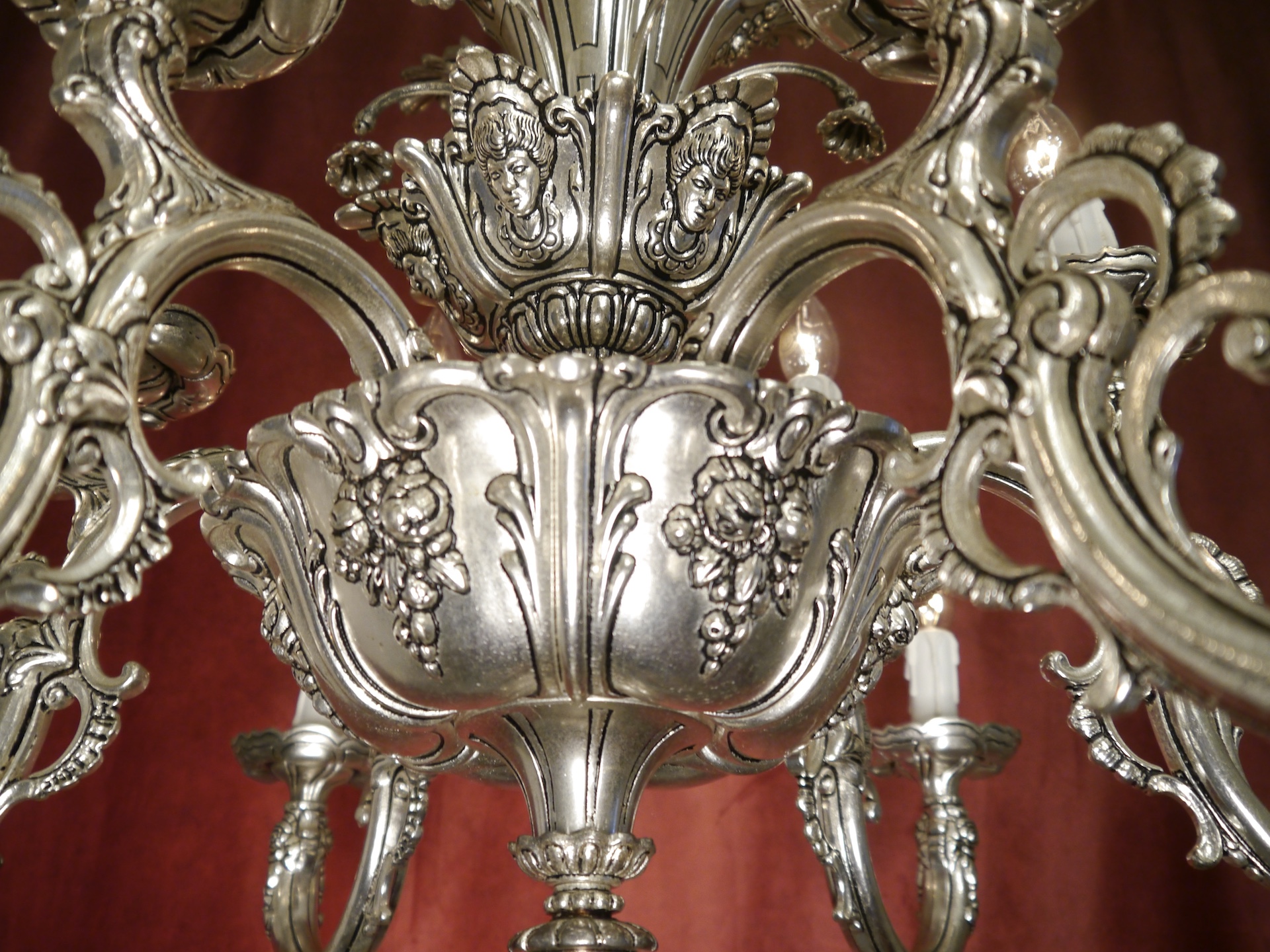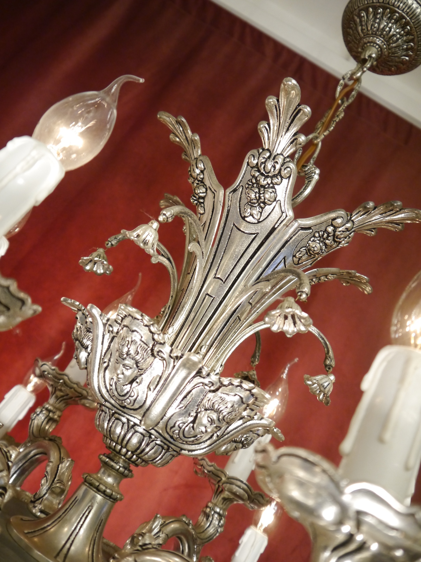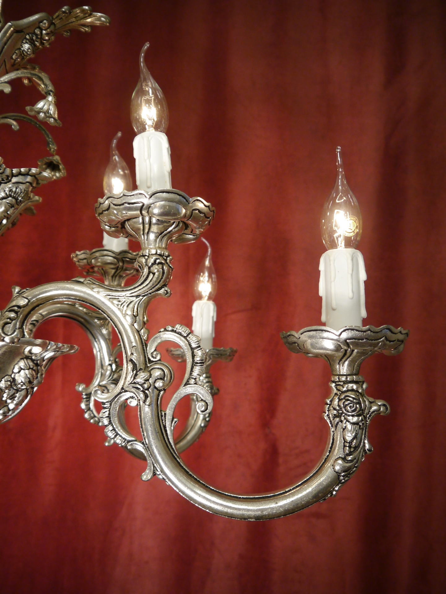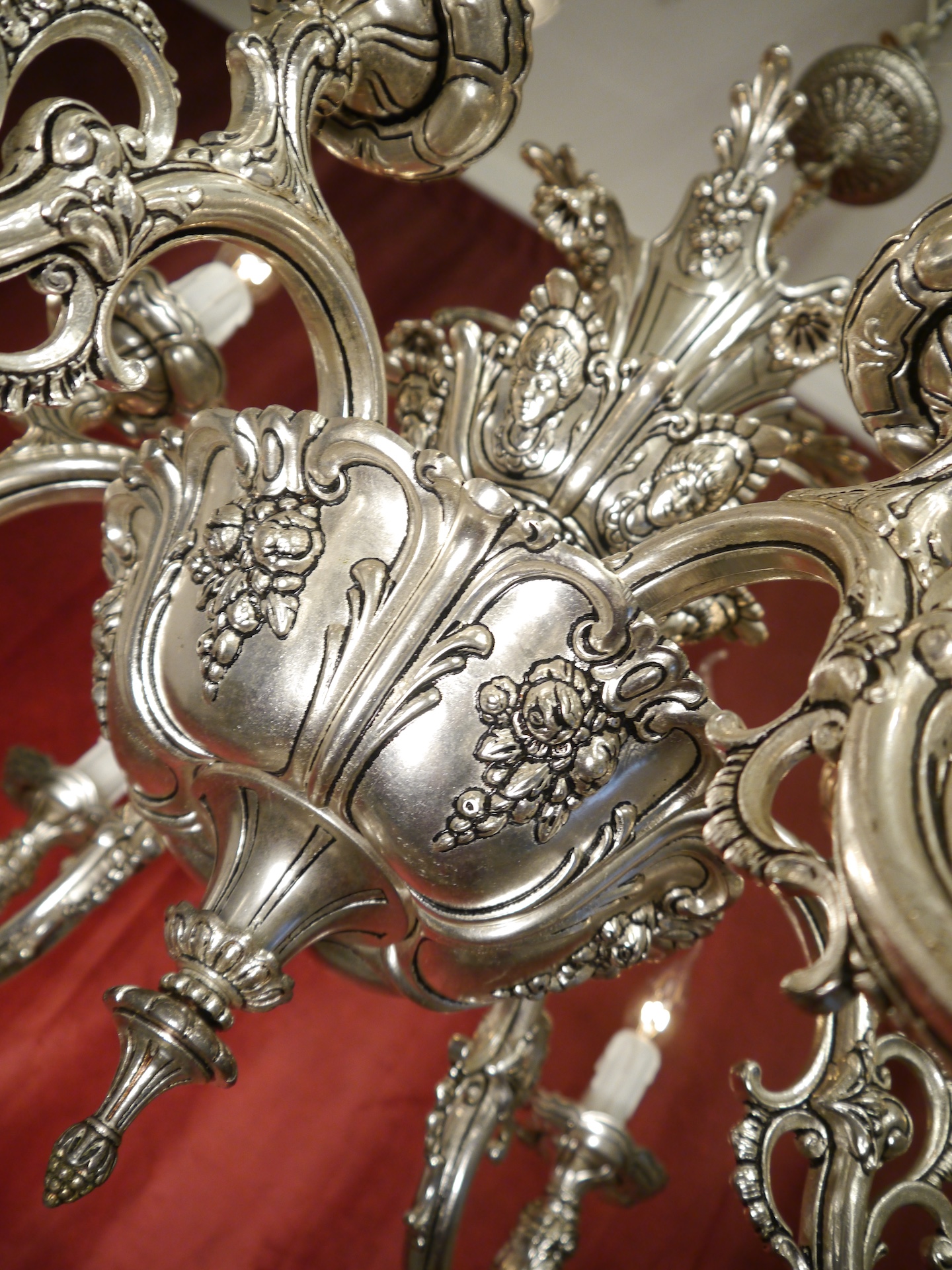 Gefertigt aus massivem Messing und veredelt mit einer glänzenden Nickel- bzw. Silberoberfläche, verbindet der Leuchter Eleganz mit kraftvoller Substanz. Mit einem Gewicht von ca. 19 kg handelt es sich um eine sehr solide und hochwertige Lichtquelle mit beeindruckender Präsenz.