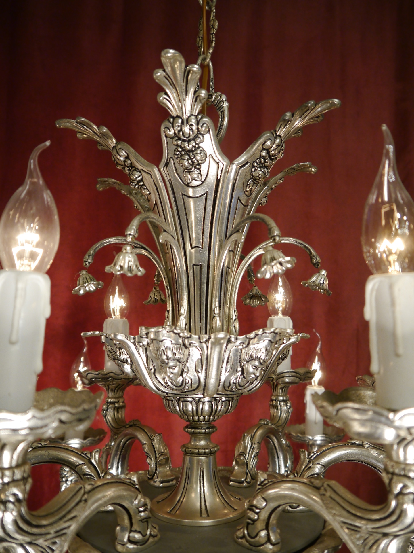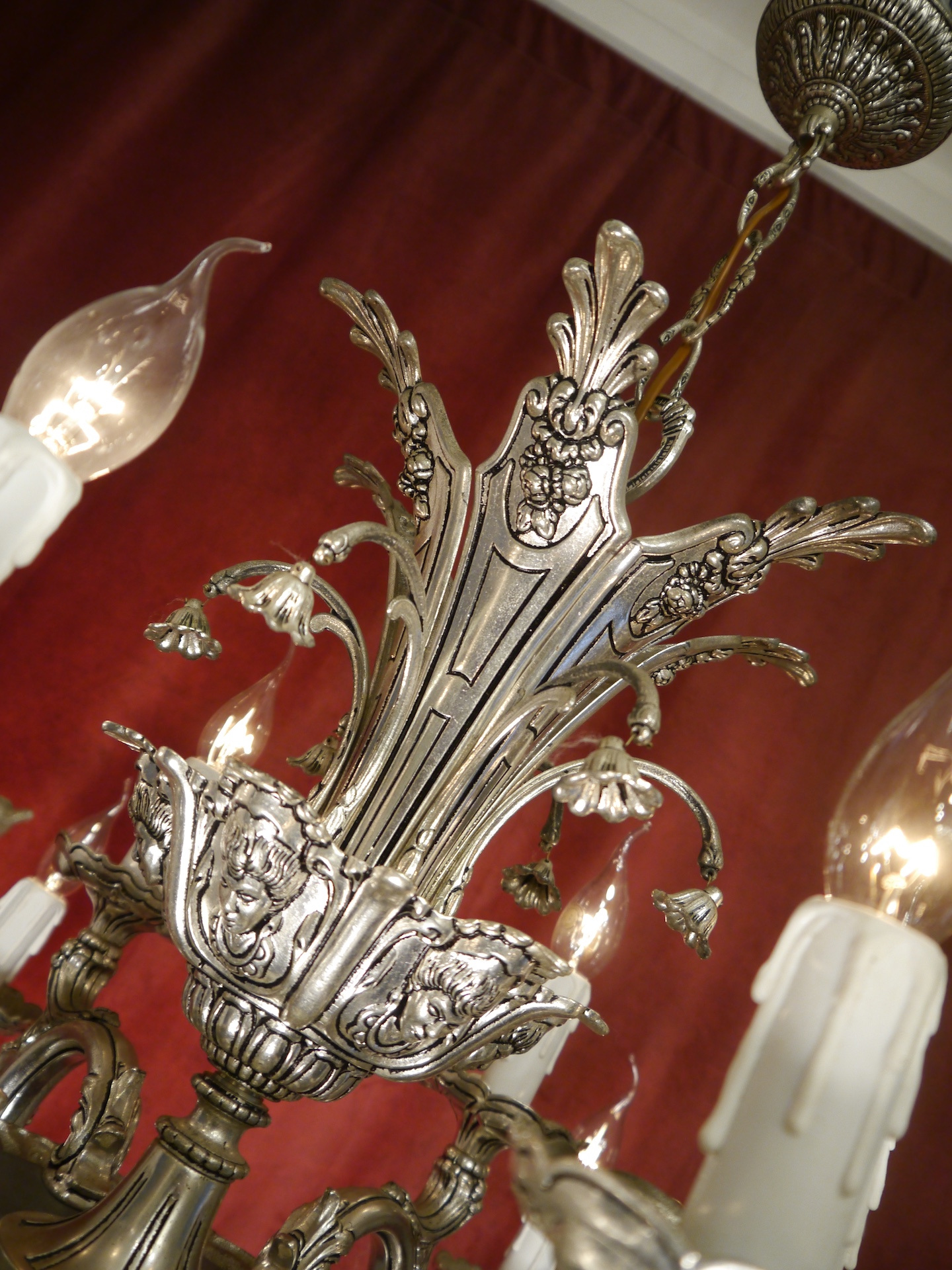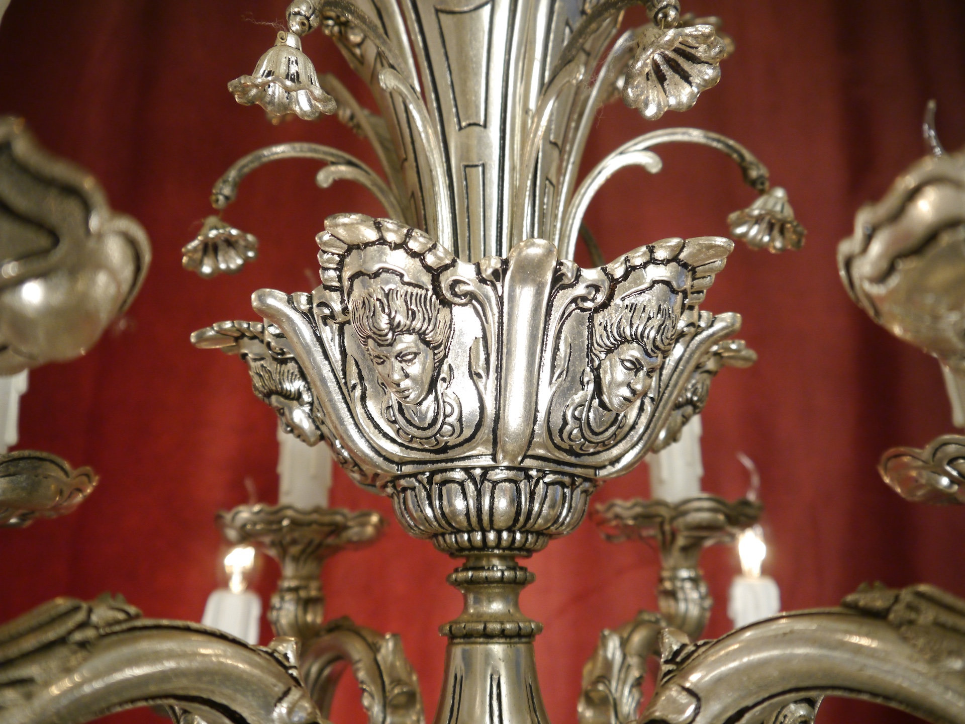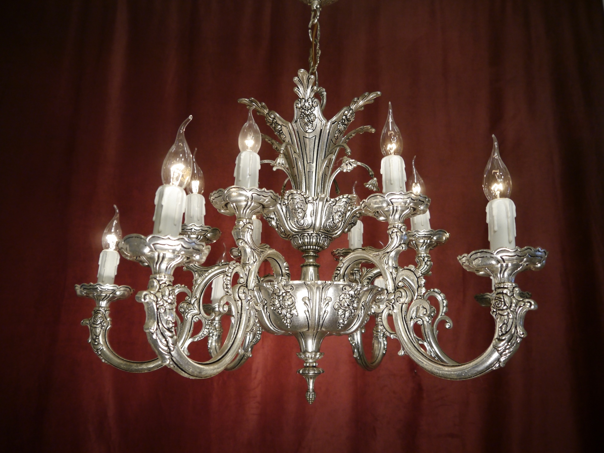 Gefertigt aus massivem Messing und veredelt mit einer glänzenden Nickel- bzw. Silberoberfläche, verbindet der Leuchter Eleganz mit kraftvoller Substanz. Mit einem Gewicht von ca. 19 kg handelt es sich um eine sehr solide und hochwertige Lichtquelle mit beeindruckender Präsenz.